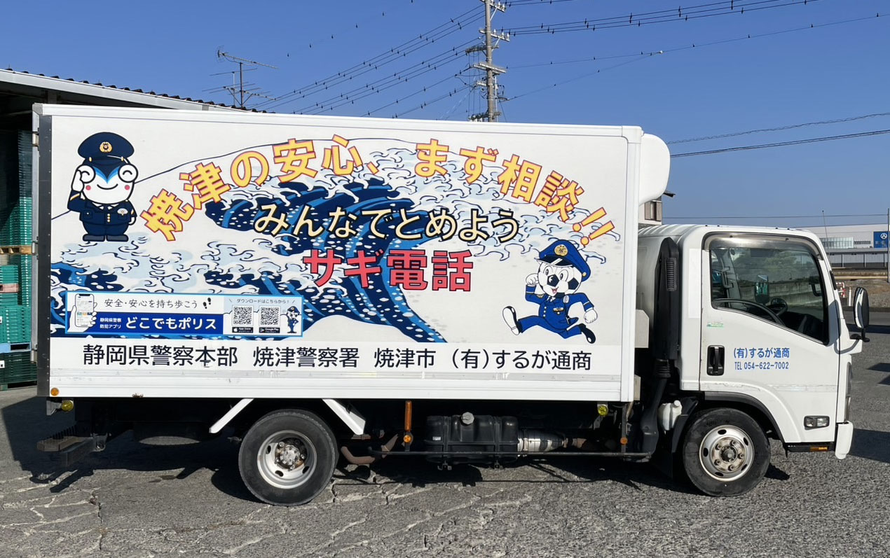 【静岡】静ト協中部支部(松林彰支部長、やよい産業)と、するが通商(杉本貴彦社長、焼津市)はこのほど、静岡県警本部、焼津警察署と連携して特殊詐欺防止を呼びかけるデザイントラックを制作。運行を通して意識啓発を促していきたい考えだ。