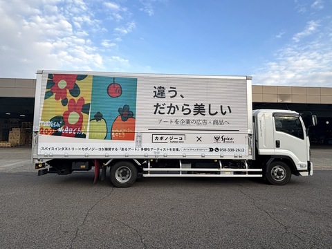 スパイストラフィックス(中村剛社長、岐阜県羽島郡岐南町)はこのほど、障がい者アートを取り扱うカポノジーコ(大阪市中央区)との連携でデザイントラックを制作。運行を通して作品の周知などを進めていきたいとしている。